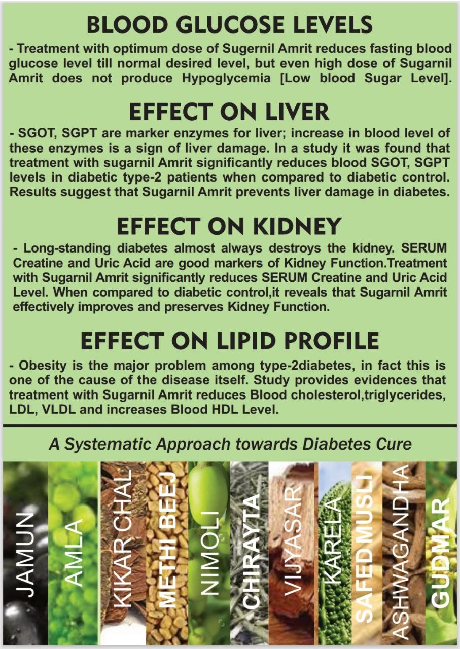 -Obesity is the major reason of Type-2 Diabetes. Treatment with Sugernil Amrit reduces blood cholesterol, triglycerides, LDL,VLDL and increases Blood HDL Level.